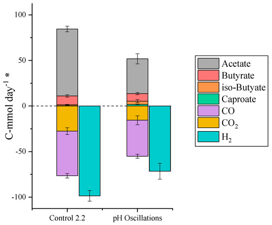 The control 2.2 set in TBR2 after the 4.8 g L−1 ethanol supplementation showed a very high specificity towards acetic acid production (86% of C-mol produced). Most probably the suppression of endogenous ethanol production, induced by the exogenous addition of ethanol, was not recovered after stopping the ethanol supplementation. To restore the production of ethanol, a strategy based on pH cycles, i.e., 24 h cycles comprised of 18 h of natural acidification and 6 h of pH control at pH 6, was tested. The use of pH cycles has proven successful to improve ethanol production yields from syngas in pure cultures [25], but it had not been tested in mixed cultures before. Hereby, the pH cycles did improve the yields of butyric and caproic acid (16 and 3% of C-mol production, respectively, vs. 11 and 0% in control 2.2), but decreased the gas consumption and therefore the overall productivity of the process (Figure 4). An explanation could be that the pH cycles disturbed the acetogenic growth, as the suspended biomass concentration decreased significantly during this study (Table S1, Supplementary Material). Additionally, the production of iso-butyric acid was the highest in this study, reaching 0.6 g L−1 and implying a positive impact of pH cycles in the production of branched carboxylic acids.