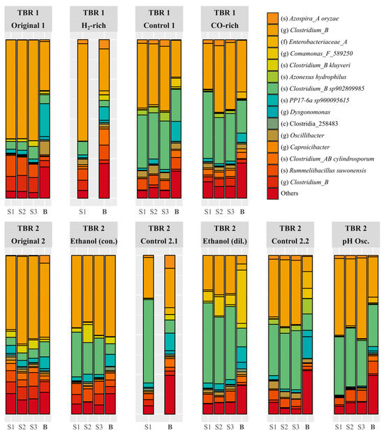 Relative abundance of the main ASVs identified in biofilm (B) and suspended growth (S1, S2, S3) samples in the steady-states reached in the two TBRs. The deepest taxonomic level known for each ASV is indicated in the legend as class (c), family (f), genus (g), and species (s). The species was only given for confidence values above 99%.
