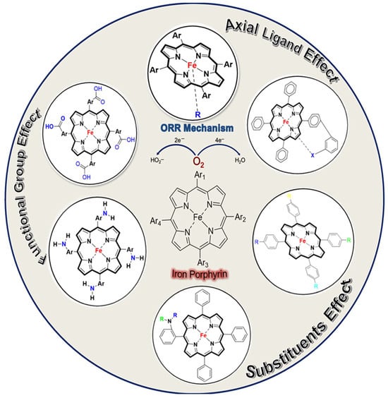 Iron porphyrins appear to be an excellent alternative to platinum. They have garnered much attention because of their catalytic efficiency, structural versatility, and mechanistic innovation [,]. A typical iron porphyrin is a metalloporphyrin complex in which an iron ion is coordinated and held within a porphyrin ring, as shown in Figure 1 []. This porphyrin ring is a large, aromatic macrocycle composed of four pyrrole subunits connected via methine bridges (=CH-) []. In iron porphyrins, the iron ion binds to the pyrrole central nitrogen atoms of the inner porphyrin ring, resulting in a robust, coordinated iron–nitrogen (Fe-N4) chemical environment [,]. The central metal can exist in various oxidation states, most commonly Fe2+ or Fe3+, and it can bind other ligands, thus making it an essential component in different biological and synthetic systems. Iron porphyrin complexes, such as heme, are present in proteins and enzymes. These serve in oxygen binding and transport in hemoglobin, oxygen storage in myoglobin, and electron transfer in cytochromes b and c [,]. Also, it is necessary for oxygen activation in cytochromes oxidase and the catalytic breakdown of peroxide in peroxidase and catalase [,,]. The varied functions of heme in O2 and H2O2-related processes are underpinned by their finely modifiable functions based on the chemical environment and the type of ligands present [,,]. For instance, cytochrome c oxidase activates oxygen at its heme iron porphyrin site, initiating a process of breaking the O=O bond. This action creates a crucial intermediate, the Fe (IV)-oxo porphyrin cation radical, which is essential in reducing oxygen to water via the 4e− route [,,]. As electrocatalysts, iron porphyrin complexes can facilitate ORRs at lower overpotentials than other catalysts. The ORR efficiency through the 4e− path can be optimized by altering the electronic properties of the iron porphyrin, which is achieved through the precise tuning of the porphyrin ring. Introducing various axial ligands, functional groups, or substituents allows for such modifications, which influence the electronic environment around the iron center. As illustrated in Figure 2, these effects, including axial ligand, functional group, and substituent modifications, are key to enhancing ORR performance. These structural adjustments offer deeper insight into the electron transfer processes and allow for better control over the reaction kinetics and selectivity [].