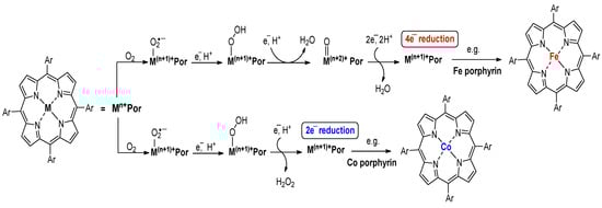 The ORR mechanism, shown in Figure 3, suggests that the selectivity of the ORR pathway depends on the transition metal coordinated within the porphyrin. As previously mentioned, iron porphyrins can catalyze the reduction of O2 to H2O via a four-electron process, in contrast with cobalt porphyrin, which tends to catalyze the reduction of O2 to H2O2 through the two-electron process [].