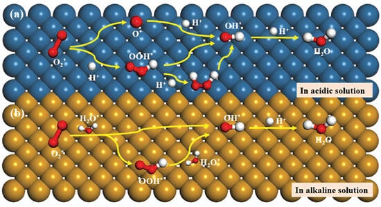 Figure 4 provides the intermediates that formed during the ORR process. It begins with the heterolytic cleavage of the O=O bond. The asterisk (*) denotes active catalyst sites.