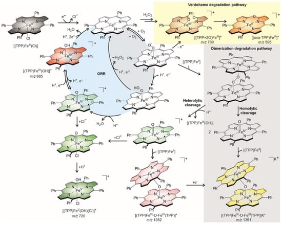 Surendran, A.K. et al. investigated the ORR mechanism catalyzed by an iron (II) tetraphenyl porphyrin complex [FeIITPP]. They used voltammetry, electrochemical impedance spectroscopy, and electrospray ionization mass spectrometry to monitor the ORR process and track reaction intermediates. The entire mechanism can be seen in Figure 6. The mechanism commences with the reduction of [FeIIIClTPP)] to the [FeIITPP] complex, where it converts O2 to two molecules of water through a series of proton and electron transfers. As the ORR process occurs, several intermediates are formed, along with several degradation pathways. The kinetics of the mechanism, as well as the number of intermediates created, are dependent on the proton concentrations [].