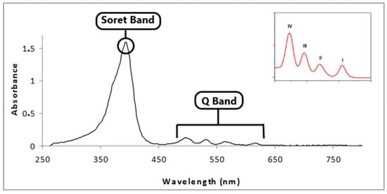 The UV-Vis spectrum of free-base porphyrin with an enlargement of Q band region. Reproduced from Ref. [], free-to-use rights.