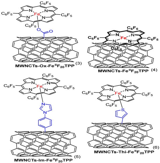 The formed iron porphyrin complex is usually combined with supporting materials such as carbon nanotubes, graphene, carbon black, or metal–organic frameworks (MOFs) to enhance electrical properties. Combining iron porphyrins with conductive materials significantly enhances their conductivity, catalytic activity, and stability. The composite is produced mainly through physical mixing, where the support material adsorbs the iron porphyrin. Usually, the iron porphyrin and the support material are ultrasonicated in a solvent to ensure even dispersion, and the solvent is evaporated to obtain the iron porphyrin-based composite material [].