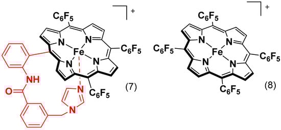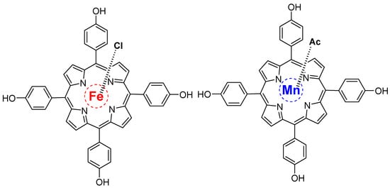 Modifications to the peripheral substituents at the meso- or β-positions on the porphyrin ring can influence the electron density at the iron center [,]. Tailoring at the meso-positions is often favored over the β-positions for several reasons. First, alterations at the meso-positions of porphyrins are significantly more straightforward than the β-positions. Meso-substituted porphyrins can be produced using several established techniques, including the reaction of pyrrole with aromatic aldehydes, providing greater versatility and improved yields. β-substituted porphyrins have more complicated synthetic routes, which results in a lower yield []. Second, substituents at the meso-positions tend to exert greater influence on the electronic properties of the porphyrin structure. Research indicates that the meso-substituents can change the redox potential of porphyrins more effectively than β-substituents, which is vital in catalysis applications [,]. Third, porphyrins altered at the meso-site normally maintain their planar structure better than those adjusted at the β-site. Changes at the meso-position do not disrupt the ring’s core conjugation and do not produce major steric hindrances, which allows for the retention of the flat form. Adjustments at the β-positions can frequently cause steric problems, disrupting the ring’s planarity. This can negatively affect the porphyrin’s electronic properties and even hinder the accessibility of reactants to the catalytic site [,].