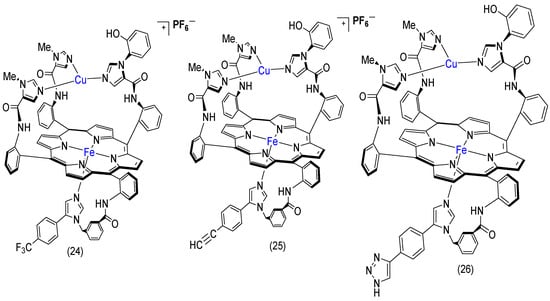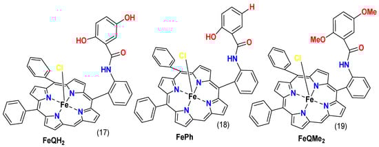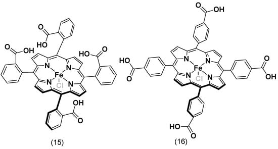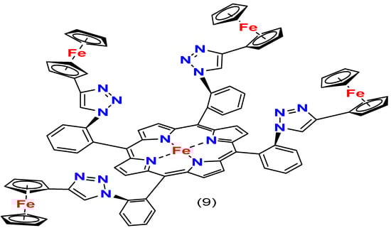 Many studies reveal the effectiveness of modifying the substituents on the iron porphyrin ring. For instance, Mittra, K. et al. found that an iron porphyrin catalyst with four ferrocenes and a hydrogen bonding distal pocket (complexes 9, Figure 12) promotes the reduction of O2 through the 4e−/4H+ process in an organic solvent under homogenous conditions in the presence of trifluoromethanesulphonic acid. This catalyst exhibits consistent efficiency and selectivity over a range of pH values, and it can perform the same oxygen reduction in an aqueous solution under heterogeneous conditions [].