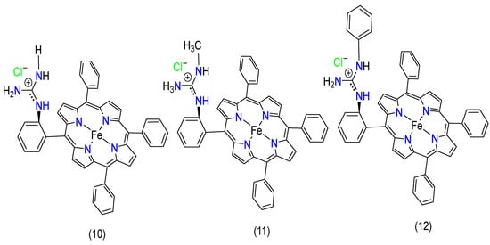 In 2019, Ghatak, A. et al. formulated iron porphyrins, attaching pendant guanidine groups by covalent bonds, resulting in complexes 10–12 (Figure 13). Their findings indicate improved kinetics and selectivity for the 4e−/4H+ pathway during ORRs. The researchers also introduced an axial imidazole ligand to increase selectivity, which produced minimal partially reduced oxygen species (PROS) during the ORR process [].