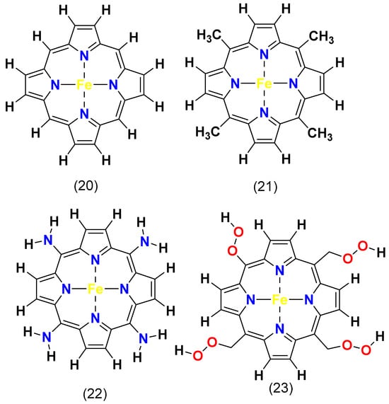 The presence and nature of axial ligands bounded to the center iron atom can modulate the electronic environment of the complex. These ligands increase the electron density on the central ion, modifying the binding strength and activation of O2, influencing the ORR efficiency and selectivity. The increased electron density on the metal ion can facilitate electron transfer to the O2, which lowers the activation energy for O=O cleavage [,]. Also, ligands affect the coordination number of the iron center, which restricts the available sites for oxygen binding and reduction. A lower coordination number provides more open sites for oxygen binding, which enhances ORR activity. The axial ligand interactions with the iron porphyrin can often improve ORR selectivity and efficiency [,].