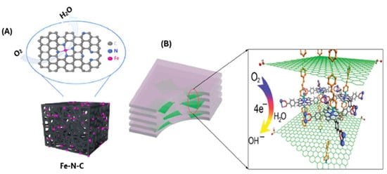 The majority of the energy that is consumed worldwide is produced through the combustion of fossil fuels []. The extensive use of fossil fuels for industrial and economic development has birthed an energy crisis and many environmental issues, such as global warming, climate change, and air pollution. For instance, when fossil fuels are combusted, harmful by-products (pollutants) such as nitrogen oxide (NOx), sulfur dioxide (SOx), volatile organic compounds (VOCs), and particulates are produced, which all have deleterious effects on the environment [,]. Hence, using fossil fuels negatively affects the environment and the world’s economy and threatens human health [,,]. To mitigate the adverse environmental effects and produce clean, sustainable energy, advancing renewable energy technology that produces low carbon emissions is essential. Among advanced technologies, polymer electrolyte membrane fuel cells (PEMFCs) and metal–air batteries are promising for powering automotive and household appliances [,,,]. Compared to internal combustion engines, PEMFCs can produce electrical energy with an impressive efficiency of 40–60% [,]. Metal–air batteries, for their part, generate electricity through chemical reactions between a metal (such as zinc) and oxygen from the air, where the metal acts as the anode and the oxygen acts as the cathode for the chemical reaction. Metal–air batteries offer an eco-friendly option and achieve energy efficiency levels that have a five to thirty times higher energy efficiency than lithium-ion batteries []. They are perceived as a sustainable energy alternative due to their eco-friendly, non-toxic, and low-cost nature, and they are a viable alternative as metals are abundant in nature [,]. These technologies utilize ORRs to convert chemical energy into electrical energy [,]. For example, a typical H2/O2 PEMFC oxidizes hydrogen (H2) at the anode, producing protons (H+) and electrons (e−). This is known as the hydrogen oxidation reaction (HOR), as seen below [,,].