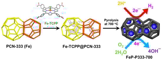 - Park, J.; Lee, H.; Bae, Y.E.; Park, K.C.; Ji, H.; Jeong, N.C.; Lee, M.H.; Kwon, O.J.; Lee, C.Y. Dual-Functional Electrocatalyst Derived from Iron-Porphyrin-Encapsulated Metal–Organic Frameworks. ACS Appl. Mater. Interfaces 2017, 9, 28758–28765. [Google Scholar] [CrossRef] [PubMed]