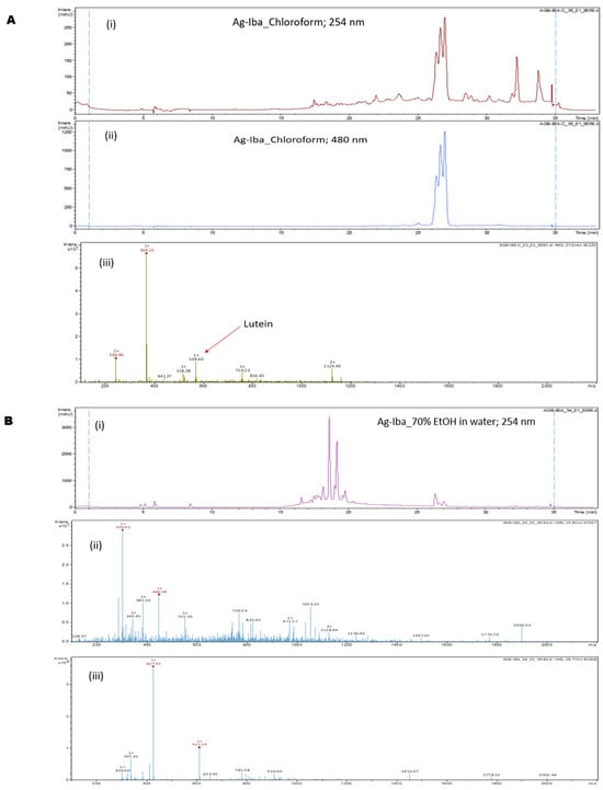 LC-MS analysis, monitoring at 254 nm and 480 nm, revealed that the xanthophyll carotenoids lutein and zeaxanthin are significant components of Ag-Iba CHCl3 extract (A(i–iii)). In contrast, Ag-Iba aqueous alcoholic extract has parent ion peaks at 303.02 [M + H]+, 449.09 [M + H]+, 595.15 [M + H]+, and 611.13 [M + H]+ (B(i–iii)). The positive ion mode is presented for clarity.
