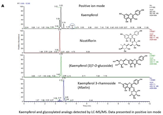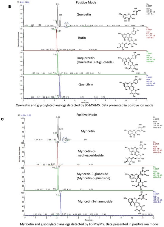 MS/MS analysis on the Ag-Iba aqueous alcoholic extract revealed the presence of (A) kaempferol and glycosylated analogs, (B) quercetin and glycosylated analogs, and (C) myricetin and glycosylated analogs. The data are presented in the positive ion mode.