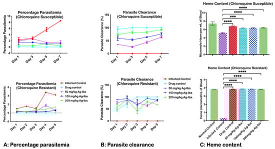 Malarial parasite load increased in erythrocytes when not treated but decreased with a sufficient therapeutic drug dose. In this case, this herbal combination reduced the parasite load dose-dependently, indicating that the solvent system extracts potent phytochemicals from the herbal mixture. Specifically, on day 7 of the phase I experiment, there was no significant difference between the percentage parasitemia value of the standard drug and the highest dose (200 mg/kg) of the herbal mixture (Figure 3A). Consequently, the parasite clearance (chemo-suppression) increased dose-dependently (Figure 3B), and there was no significant difference between the chemo-suppressive effect of the standard drug and the herbal cocktail. Similar results were observed in the phase II experiment, where the curative potentials of Ag-Iba were determined against mice infected with chloroquine-resistant Plasmodium berghei. It was also observed that Ag-Iba decreased the parasite load over five days against the increase in the parasite load in the infected control (Figure 3C). Correspondingly, the parasite clearance increased over five days (Figure 3B). The determination of heme content showed that the herbal mixture improved the treated group’s heme content. Although the heme content of the infected groups treated with the herbal mix decreased (p < 0.0001) when compared with a standard control, there was no significant difference between the heme content of the infected mice treated with 100 and 200 mg/kg of the herbal mixture and the standard drug. However, there was a 50 mg/kg decrease (p < 0.05) in mice infected with chloroquine-sensitive and chloroquine-resistant strains of Plasmodium berghei (Figure 3C).