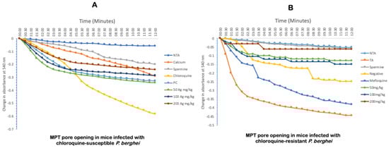 The kinetic effects of the herbal mixture on mitochondrial permeability transition pores (MPT). These figures depict the extent of liver mitochondria isolated from the infected control response to permeabilization due to Plasmodium berghei infection. They also show that the reversal effect of the administered drug leads to parasite-induced permeabilization in mice infected with chloroquine-susceptible (A) and chloroquine-resistant (B) strains of Plasmodium berghei. Normal mitochondria without Triggering Agent (NTA); normal mitochondria with Triggering Agent (TA)—calcium; parasitized control (PC) without any treatment.