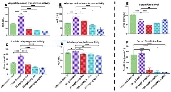Previous studies have detected Plasmodium antigens in the glomeruli, suggesting that Plasmodium infection can directly affect the kidney and thus trigger the inflammatory process, leading to glomerulonephritis and affecting kidney function. Although currently out of use because of their ineffectiveness against the resistant Plasmodium species, the long-term use of chloroquine [], and quinine [,] has been linked with renal injury. Other clinical manifestations of the involvement of the kidney in malaria disease include proteinuria and albuminuria. These effects may further show an increase in serum urea and creatinine. We further observed that serum urea and creatinine levels in the infected control mice group and those infected but treated with the drug control increased (Figure 4A,B), contrary to what was observed in the serum levels of urea and creatinine of mice infected with Plasmodium berghei but treated with Ag-Iba. The preceding observations imply that Ag-Iba also has a protective effect on the kidney and its anti-plasmodial effect.