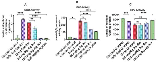 Effects of the herbal mixture on superoxide dismutase (SOD) (A), catalase (B), and glutathione peroxidase (GPx) (C) activities in Plasmodium berghei-infected mice. The experiments were performed thrice, and the data are expressed as mean values ± SD. Not significant (ns); * = p < 0.05; ** = p < 0.01; *** = p < 0.001; **** = p < 0.0001 comparisons between the mean values of the test groups and controls.