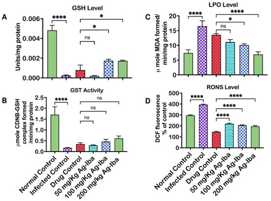 In response to Plasmodium infection, phagocytes such as macrophages and neutrophils generate reactive oxygen and nitrogen species (RONS) as a natural defensive mechanism, as observed in the infected control in this study compared with the standard control (p < 0.0001) (Figure 8D). However, when the parasite burden decreases, the levels of these reactive species decrease because of the effectiveness and potency of the administered drug. The administered standard drug reduced (p < 0.0001) the serum level of these reactive species compared to all the doses of Ag-Iba used in this study.