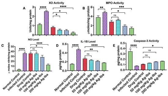 Effects of the Ag-Iba herbal mixture on biomarkers of oxidative stress using xanthine oxidase (XO) (A), myeloperoxidase (MPO) (B) activities; inflammation nitric oxide (NO) (C), and interleukin-1β) (D) levels, and apoptosis via the activity of the executioner caspase (caspase-3) (E). The experiments were performed thrice, and the data are expressed as mean values ± SD. * = p < 0.05, ** = p < 0.01; *** = p < 0.001; **** = p < 0.0001 among the test groups and controls; ns means not significant.