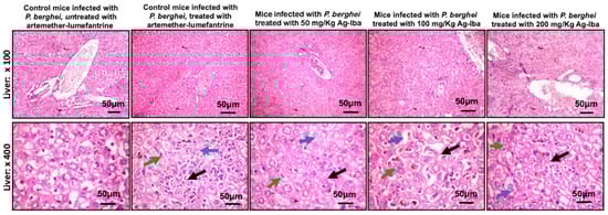 The liver of the normal un-infected mice showed moderate disseminated congestion (blue arrows), mild microvesicular steatosis (green arrows), and the liver of the infected control showed mild to moderate disseminated periportal infiltration by inflammatory cells (black arrows) and moderate disseminated infiltration of zone 2 by inflammatory cells (black arrows) Figure 10. The liver of mice treated with the control drug showed moderate disseminated congestion/thrombosis (blue arrows) and mild microvesicular steatosis (green arrows). In contrast, those treated with 50, 100, and 200 mg/kg of Ag-Iba showed mild macrovesicular steatosis (green arrows), mild to moderate disseminated periportal infiltration by inflammatory cells, mild macrovesicular steatosis (green arrows), mild to moderate disseminated periportal infiltration by inflammatory cells and moderate disseminated infiltration of zone 2 by inflammatory cells (black arrows) and moderate disseminated congestion (blue arrows), mild macrovesicular steatosis (green arrows), and mild to moderate disseminated periportal infiltration by inflammatory cells and moderate disseminated infiltration of zone 2 by inflammatory cells (slender arrows), respectively.