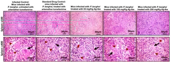 Plates showing the histology of the spleen of the infected control, infected control, treated with a standard antimalaria drug (artemether-lumefantrine), and infected mice treated with 50, 100 and 200 mg/kg doses of Agunmu-Iba (Ag-Iba). Lesion in the section of the spleen are indicated by red arrows.