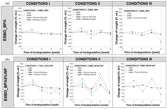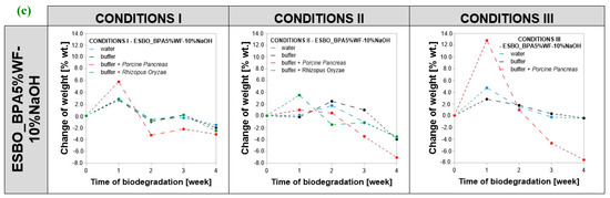 For all samples subjected to biodegradation, a change in mass concerning initial value was recorded (Figure 3). The analysis of changes in the mass was considered as the percent of weight loss of samples (marked as %wt.) and it was calculated as , where —samples’ weight change in each week, —samples’ measured weight in a given week, and —weight of a sample before degradation. Comparing the obtained results, it was found that the greatest changes in the mass were recorded for samples incubated in conditions II. The overall recorded weight loss after conducting the process in the full 4-week cycle was at the level of −7.0 %wt. (ESBO_BPA5%WF-10%NaOH), concerning the weight of the samples before enzymatic degradation. In turn, in the case of conditions I and III, a weight loss also was recorded; however, the change was smaller than for samples degraded in conditions II with a maximum of −4.7 percentage weight loss (ESBO_BPA5%WF). Simultaneously, the greatest mass changes were recorded for samples incubated in the presence of the Porcine Pancreas enzyme regardless of the conditions, including the type of buffer and incubation temperature, in which the degradation was carried out. In turn, in the case of samples degraded in the presence of the Rhizopus Oryzae enzyme, the samples’ weight changes were smaller than in the case of samples incubated in the presence of the Porcine Pancreas enzyme. Based on the obtained results, it can be assumed that in the degradation of epoxy-polyurethane wood composites based on epoxidized soybean oil the Porcine Pancreas enzyme exhibits a greater ability for hydrolyzing chemical bonds within the structure of degraded samples, especially when using a complex mixture buffer solution PB2, temperature 30 °C and pH equal to 6.8.