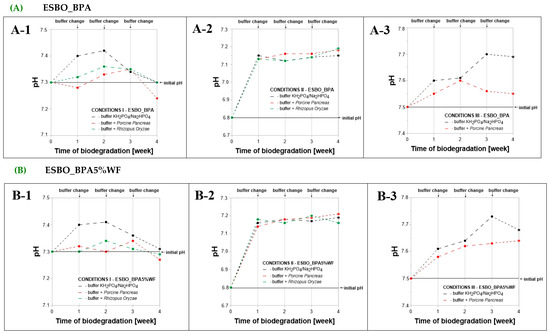 During the enzymatic degradation using two types of lipases, the incubation solutions were replaced with fresh ones after each week of conducting the process. It was found that, depending on the conditions in which degradation of bio-composites took place, various changes in values of pH were recorded concerning the initial values measured for each phosphate-buffer solution (Figure 4). In general, each week the recoded values were higher than the pH value for the freshly applied solution. Considering single conditions through time, the course of changes, characteristic for buffer solutions without enzymes is practically the same. The differences can only be considered due to the type of enzyme applied in the incubation solution. Within condition I, after the last week of the degradation process, the biggest drop in pH value was recorded for the Porcine Pancreas degradation solution of ESBO_BPA (change from pH = 7.3 to pH = 7.25). Even smaller differences between solution with and without the enzyme are noticeable for condition II, for which each week the recorded increase in pH value was similar and after the four weeks of degradation the value of pH was on the level of 7.15–7.19. The biggest changes within the course of the pH changes through the process comparing the pure buffer solution and the one with ePP were observed for conditions III. Especially for samples ESBO_BPA5%WF-NaOH, in the case of the first week of incubation, a sharp increase in pH value was recorded for the enzyme solution. It is worth highlighting that, during that time for this composite, the biggest increase in the weight of samples was also noticed. Such a phenomenon may indicate that together with the swelling of samples, considered especially as swelling of its modified lignocellulosic filler, the hydrolysis of -ONa groups took place.