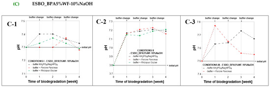 Change in pH of the incubation solutions, depending on conditions of the performed enzymatic degradation in the presence of lipases ((A-1–C-1)—conditions I: T = 37 °C, pH = 7.3, in a KH2PO4/Na2HPO4 phosphate buffer environment; (A-2–C-2)—conditions II: T = 30 °C, pH = 6.8, in complex phosphate buffer environment and (A-3–C-3)—conditions III: T = 40 °C, pH = 7.5, in a KH2PO4/Na2HPO4), and the samples subjected to degradation ((A)—ESBO_BPA, (B)—ESBO_BPA5%WF, and (C)—ESBO_BPA5%WF-10%NaOH).