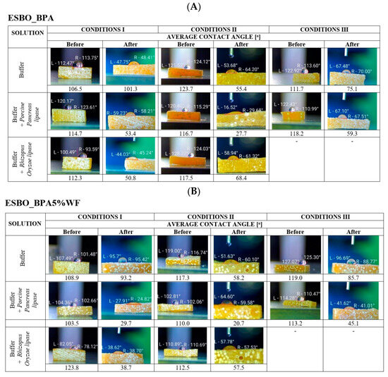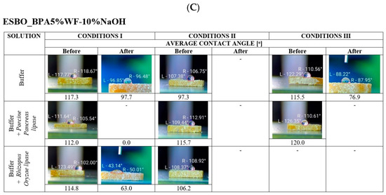 The average value of the contact angle before and after the biodegradation process. Images within the above tables show one of three samples, subjected to degradation under given conditions, while the value below represents the resultant average value. ((A)—ESBO_BPA, (B)—ESBO_BPA5%WF, and (C)—ESBO_BPA5%WF-10%NaOH)