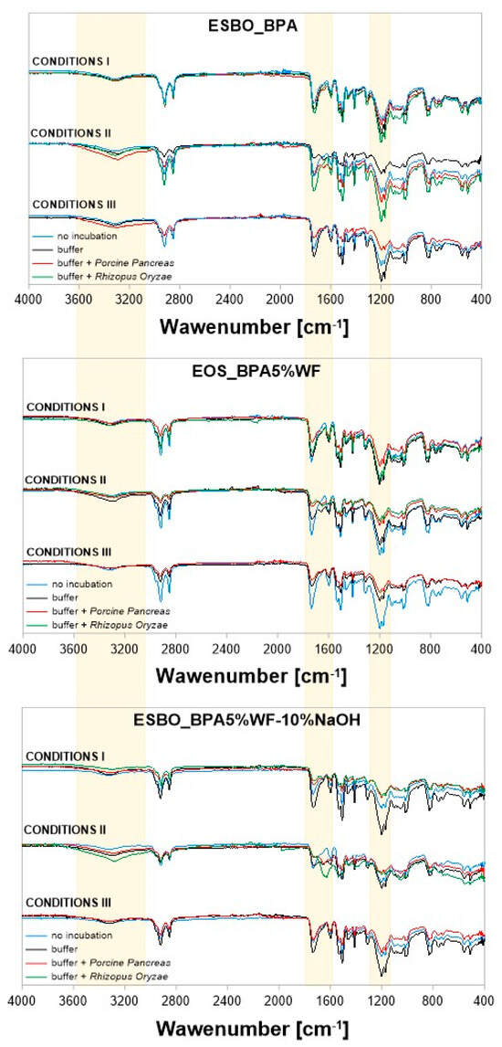 FT−IR spectra of the composite samples subjected to enzymatic degradation: ESBO_BPA, ESBO_BPA5%WF, and ESBO_BPA5%WF-NaOH.