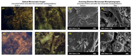 Microscopic analysis of selected samples: (A–D)—ESBO_BPA and (E–H)—ESBO_BPA5%WF-10%NaOH before and after enzymatic degradation (images A-B and E-F recorded using an optical microscope with transmitted light and 40× magnification, while (C,D) and (G,H) recorded using Scanning Electron Microscope at 5 kV acceleration with dusting the surface of samples with a thin film of gold).