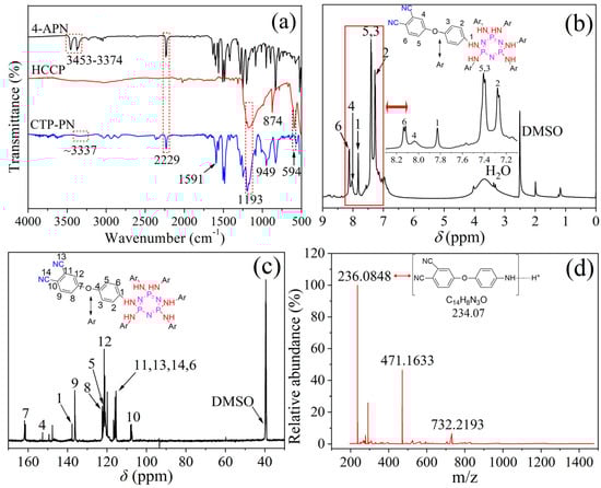 (a) FT–IR spectrum of 4-APN, HCCP, and CTP–PN. (b) 1H–NMR spectrum of CTP–PN. (c) 13C–NMR spectrum of CTP–PN. (d) MS spectrum of CTP–PN.