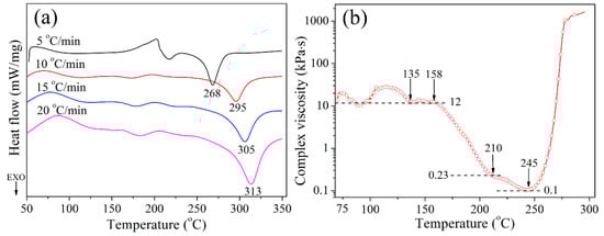 (a) DSC curves of CTP–PN with different heating rates and (b) changes in the complex viscosity of CTP–PN as a function of the temperature from 70 °C to 300 °C.