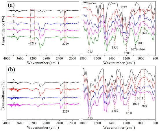 (a,b) FT–IR spectra of CTP–PN cured at different temperatures.