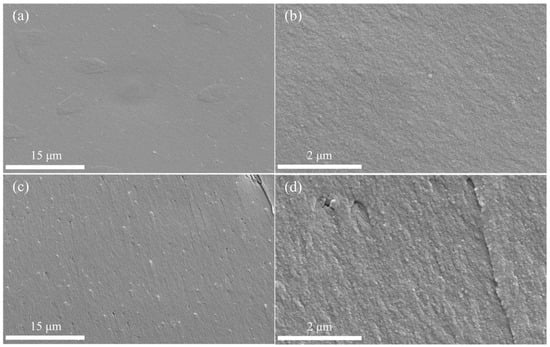 According to the FT–IR analysis of cured CTP–PN, the absorption intensity of nitrile groups obviously decreased after curing at 240 °C. This indicates that there is a significant occurrence of the curing reaction of CTP–PN. After further increasing the temperature to 280 °C, the absorption band corresponding to nitrile groups almost completely disappeared, implying a higher curing degree of CTP–PN. To study the influence of different curing degrees, SEM was used to scan the fracture morphology of cured CTP–PN. The fracture morphology of cured CTP–PN films (cured at 240 °C and 280 °C) is shown in Figure 4. Figure 4a,b show the fracture morphology for curing at 240 °C, where it can be seen that the cured CTP–PN film has a very smooth surface with no cracks or holes present. This is because, although the curing reaction of nitrile groups was efficiently triggered at 240 °C, the curing degree of nitrile groups remained relatively low, resulting in the formation of incomplete crosslinking networks. In Figure 4c, after curing at 280 °C, raised particles and shallow holes are observed on the surface. In Figure 4d, fracture stripes and a rough surface can be observed in the magnified photomicrographs. This indicates that the brittleness of CTP–PN can be alleviated to a certain extent by elevating the curing degree [15].