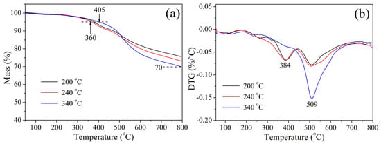 The thermal stability of cured CTP–PN (cured at 200 °C, 240 °C, and 340 °C, respectively) was studied based on TGA in a nitrogen atmosphere, and the results are presented in Figure 5a. The initial decomposition temperature of cured resins can be regarded as the temperature at which a weight loss of 5% (Td5%) occurs. It can be seen that the Td5% of cured CTP–PN is above 360 °C. When the curing temperature is increased to 340 °C, the Td5% is increased to 405 °C. Additionally, the char yield of cured CTP–PN exceeds 70% at 800 °C. Figure 5b shows the DTG curves and the temperature corresponding to the highest degradation rate (Tmax). Pure phthalonitrile resins usually exhibit outstanding thermal stability. For example, bisphenol A-based phthalonitrile cured at 280 °C has a Td5% of 430 °C and a char yield of 61.4% at 800 °C [46]. Cured resorcinol-based phthalonitrile (cured at 375 °C for 5–8 h) has a Td5% of 475 °C and a char yield of 72% at 800 °C [47,48]. However, after the incorporation of a phosphazene ring into phthalonitrile, there is a decrease in the thermal decomposition temperature. This is due to the decomposition of phosphazene rings at lower temperatures of 350–450 °C as a result of P–N bonds having lower thermal stability than C–C bonds [49]. With the increase in the curing temperature, the Td5% of cured CTP–PN dramatically increases from 360 °C to 405 °C. This is ascribed to the higher curing degree of CTP–PN, which allows it to restrict the vibration of phosphazene rings and thus increase the decomposition temperature. At temperatures above 450 °C, there is decomposition of ether bonds and nitrogen-containing aromatic heterocycles. However, CTP–PN cured at lower temperatures exhibits a lower decomposition rate and higher char yield than CTP–PN cured at higher temperatures. This is because phosphazene decomposition occurs, which results in the generation of a phosphorous-rich char layer that reduces the thermal conductivity of the sample surface. Under these conditions, the char layer further retards the thermal decomposition of the underlying matrix by hindering heat transfer from the surface to the interior [50,51]. The data for the Td5%, Tmax, and char yield are shown in Table 2.