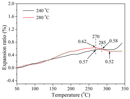 The thermomechanical properties of cured CTP–PN (cured at 240 °C and 280 °C, respectively) were studied using TMA. As shown in Figure 6, CTP–PN cured at 240 °C exhibited an expansion ratio of 0.58% at 285 °C. Above this temperature, the expansion ratio did not obviously change until reaching 320 °C. With further temperature increases, the expansion ratio rapidly increased, indicating that there was a rapid expansion of cured CTP–PN. However, although the expansion ratio of cured CTP–PN slightly increased after curing at 280 °C, there was no obvious change as the temperature was increased to 350 °C. This confirms that as the curing temperature is increased, the higher curing degree could endow cured CTP–PN with more favorable thermomechanical properties. Additionally, the coefficient of linear thermal expansion (CTE) was calculated based on the TMA test results. The results showed that the CTE of CTP–PN cured at 240 °C is 25.9 ppm/°C at 270 °C and 24.7 ppm/°C at 285 °C. For CTP–PN cured at 280 °C, the CTE is 28.4 ppm/°C at 270 °C and 24.9 ppm/°C at 285 °C. Thus, the results of the TMA demonstrate that cured CTP–PN possesses excellent thermomechanical properties [4,15,52].