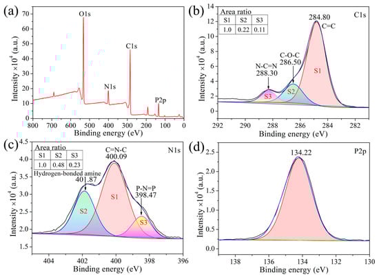 XPS was further applied to study the elemental composition of the decomposition products, and the results are shown in Figure 8. Figure 8a is the XPS survey spectrum of cured CTP–PN, which indicates the chemical composition of CTP–PN. As shown in Figure 8b, the C1s spectrum exhibits three peaks. The peak in the binding energy at 284.8 eV corresponds to the C=C bond of the benzene ring. The peak at 286.50 eV is assigned to a C–O bond, while the binding energy peak located at 288.30 eV corresponds to the N–C=N bond in the phthalocyanine, triazine, and isoindoline ring structures [54]. The N1s spectrum contains three peaks located at 398.47 eV (P–N=P), 400.09 eV (C=N–C), and 401.87 eV. The peaks assigned to P–N=P and C=N–C bonds are part of the cyclotriphosphazene structure and aromatic heterocycles containing nitrogen, respectively [55,56]. The binding energy peak at 401.87 eV is attributed to the hydrogen-bonded amine that forms between P–NH–Ph bonds [57]. As shown in Figure 8d, the P2p spectrum exhibits a single peak at 134.22 eV, indicating a P atom with the same chemical structure as in CTP–PN [55]. Hereby, the results of XPS analysis are consistent with the results of 1H–NMR and FT–IR presented above.