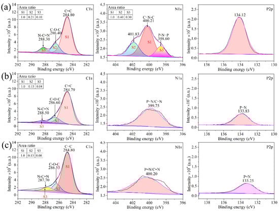 High-resolution C1s, N1s, and P2p XPS spectra of decomposition products of cured CTP–PN after treatment at different temperatures: (a) 350 °C, (b) 500 °C, and (c) 800 °C.