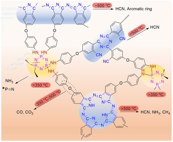Figure 9 shows the high-resolution C1s, N1s, and P2p XPS spectra of the decomposition products of cured CTP–PN. It can be seen that after treatment at higher temperatures, the decomposition products are still composed of C, N, and P elements. As shown in Figure 9a, there is no change in the C1s, N1s and P2p spectra based on a comparison to cured CTP–PN. In particular, there is no obvious change in the ratio of each chemical bond. This means there is no decomposition of cured CTP–PN at 350 °C. However, when the temperature is increased to 500 °C, rapid decomposition occurs. It can be seen that there is a significant reduction in the intensity of peaks corresponding to the C–O–C and N–C=N bonds in the C1s spectrum in Figure 9b compared to the C1s spectrum in Figure 9a. At the same time, only a single peak at 399.75 eV remains in the high-resolution N1s spectrum. This indicates that there is complete decomposition of cyclotriphosphazene and P–NH–Ph bonds. Moreover, partial decomposition of nitrogen-containing aromatic heterocycles also occurs at 500 °C. Following the decomposition of cyclotriphosphazene and P–NH–Ph bonds, there is a slight shift in the peak of the P2p spectrum from 134.12 eV to 133.83 eV, which is due to the generation of phosphorous-containing char (P=N) and the decreased presence of the electron-withdrawing group (P–NH–Ph) attached to the P atom. In Figure 9c, the C1s, N1s, and P2p spectra of residual char at 800 °C indicate that it is mainly composed of P-containing graphitic C and N [54]. Therefore, based on the results from TGA together with the FT–IR and XPS analysis of the decomposition of cured CTP–PN, we propose a potential mechanism for thermal decomposition in nitrogen, which is presented in Scheme 2 [51,58].