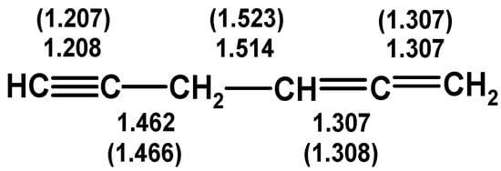 While the organic chemistry of molecules possessing the 1,2-dien-5-yne (propargylallene) motif has been comprehensively reviewed [41], their organometallic chemistry has been less well chronicled. The infrared spectrum of propargylallene itself exhibits ν(C≡C) and ν(C=C=C) stretching vibrations at 2124 and 1958 cm−1, respectively [42], and gives rise to a characteristic 13C NMR resonance at ~205 ppm for the central carbon C=C=C; its photoelectron spectrum has also been reported [43]. Since it is a liquid at ambient temperature, X-ray crystallographic data are not available, but its structure has been elucidated by electron diffraction in the gas phase [44]. Gratifyingly, the experimental bond lengths (Figure 1) are in excellent agreement with the values found from density functional calculations at both the B3LYP and MP2 levels of theory [11].