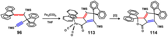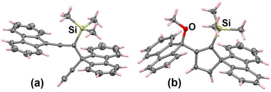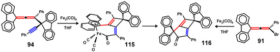 - Banide, E.V.; Oulié, P.; Müller-Bunz, H.; McGlinchey, M.J. Unexpected dimerization of a bis(fluorenyl)-bis(trimethylsilyl)-diallene to a dihydroquatercyclopentadiene, an octacyclic C36 fragment corresponding to 60% of C60: Reaction of the diallene with Fe2(CO)9. Organometallics 2008, 27, 5657–5664. [Google Scholar] [CrossRef]