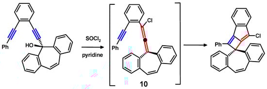 In the example shown in Scheme 4, an initial Meyer–Schuster rearrangement step is required to generate the intermediate alkynyl-chloroallene, 10, which then undergoes cyclisation to form the cyclobutene component [10].