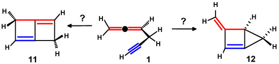However, in propargylallene, 1, either of these cycloadditions is precluded because the shortness of the one-carbon linker between the allene and alkyne units would lead to highly strained systems. One can envisage two products of interaction between the two unsaturated moieties: iso-Dewar benzene, 11, would result from [2+2] cycloaddition of the alkyne and the terminal (distal) double bond of the allene, and the other alternative would be the methylene-bicyclo[2.1.0]pentene, 12 (Scheme 6). Since these isomers of C6H6 lie ~140 kJ mol−1 higher than the enthalpy of propargylallene itself [11], their formation is extremely unlikely.