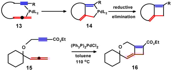 While a range of mechanisms has been elucidated, a typical reaction mode is illustrated below. Palladium-catalysed cyclisations are thought to proceed by initial π-coordination to both the double bond and the triple bond in the substrate, as in 13, followed by migratory C–C coupling to form a palladocyclopentene, 14; the final step leading to product formation is reductive elimination, thereby releasing the palladium to be available for the next catalytic cycle [2,33]. A classic example of such a process, the conversion of 15 to 16, is shown in Scheme 7 [8].