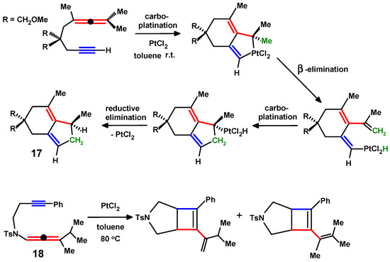 Impressively, platinum dichloride can even bring about analogous reactions at room temperature. Taking a specific example, Malacria reported that a wide range of 1,2-dien-7-ynes readily cyclise, presumably via a platinacyclopentene intermediate, to yield bicyclic products such as 17 (Scheme 8) [24]. Subsequently, Murakami [25] described the cycloisomerisation of a closely related system, 18, possessing a tosylamino unit in the tether.