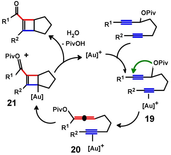 The use of Au(I) as a catalyst has been very widely studied and we show two cases as exemplars of the elegant work in this area. The transformation of bisalkynyl pivalates into tricyclic systems is shown in Scheme 9. The proposed mechanism involves the initial coordination of a gold(I) species to a triple bond, to yield the 1,7-diyne 19, which then undergoes 1,3 migration of the pivalyl moiety to form the alkynylallene 20. After [2+2] cycloaddition of the alkene and alkyne moieties, the gold is now σ-bonded, as in 21, and, in the final step, loss of pivalate leads to product and regenerates the active gold catalyst [34].