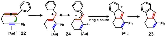 Another fine example appears in Scheme 10 and involves the initial coordination of gold(I) to the alkyne, thereby bringing about cyclisation to the intermediate cyclohexadiene, 24, now linked directly to a benzyl cation. Subsequent 4π electrocyclisation completes the sequence of consecutive ring closures from the 1,2-dien-6-yne 22 to the tricyclic system 23 [35].