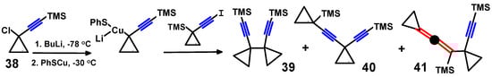 Likewise, (Scheme 15) metallation of 1-chloro-1-(trimethylsilylethynyl)-cyclopropane, 38, and then treatment with 1-iodoethynyl-1-trimethylsilylcyclopropane led to the 1,5-diyne 39, the 1,4-diyne 40, and the propargylallene 41 [46].