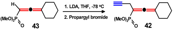 In contrast, (Scheme 16) the propargylallenyl phosphonate 42 was preparable in good yield by lithiation of the allenyl phosphonate 43 and reaction with propargyl bromide [47].