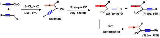 Interestingly, it has been shown that Novozym-435 (a form of Candida Antarctica lipase B) can function as an effective biocatalyst, whereby a large number of optically pure 1-ethynyl-substituted 2,3-allenols were prepared by kinetic resolution of the initial racemic products. When carried out in vinyl acetate solution at 30 °C, this procedure afforded (S)-2,3-allenols and (R)-2,3-allenyl acetates in high yields and excellent ee values. The initial racemic materials were conveniently prepared by the reaction of the appropriately substituted propargyl bromide and propynal, when mediated by SnCl2 and NaI in DMF. Subsequently, it was reported that these enantiomerically pure propargyl–allenols underwent Sonogashira coupling reactions with excellent retention of stereochemical integrity (Scheme 17) [48].